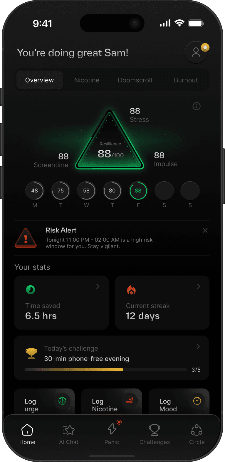 Identify risk before it turns into relapse, interrupt impulses in real time, and rebuild discipline with tools designed for daily use.